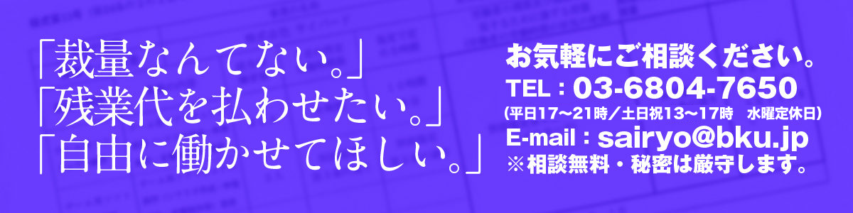 私たち裁量労働制ユニオンは、裁量労働制の不適切な運用により、残業代の未払い、長時間労働、不自由な勤務管理などで困っている労働者を支援しています。[詳細]